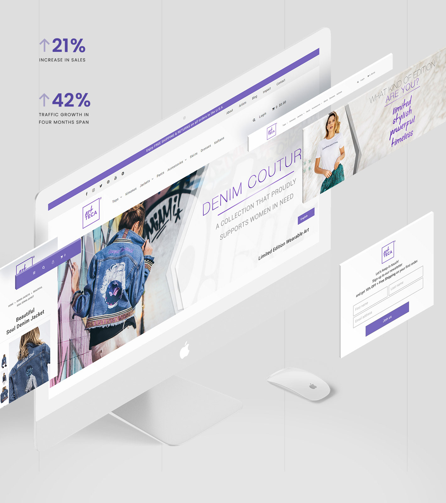 artTECA is a womenswear brand offering limited edition apparel and accessories designed in collaboration with contemporary artists from around the world. Our focus was on significantly driving more sales through a simplified UI/UX design, and using other channels to reach more customers to their online store. We redesigned their ecommerce website to simplify the customer journey and make it easier to navigate both on desktop and mobile. artTECA’s sales increased by 21% as a result due to more traffic, lower bouncing rate and a higher conversion. Advertising, social media, and email were also used as part of the digital marketing strategy.